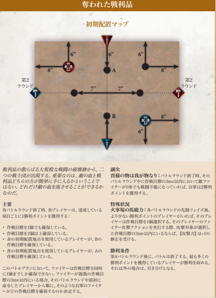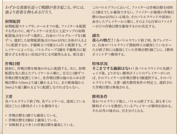 内容としてはマッチプレイ用、ということである程度両者がフェアに、かつどんな陣営でもある程度戦えるバトルプラン+特殊状況&服地目標がセットとなったものになります。特定の条件での目標確保での勝利点獲得、ということで中々頭を使いそうですね。