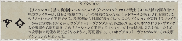 まさかのダメージを味方に肩代わりさせるという能力です。該当ユニットがいないと使えないんで使い勝手はまあまあかな。問題はリアクションで身代わりになってくれるヴァンダルさん。