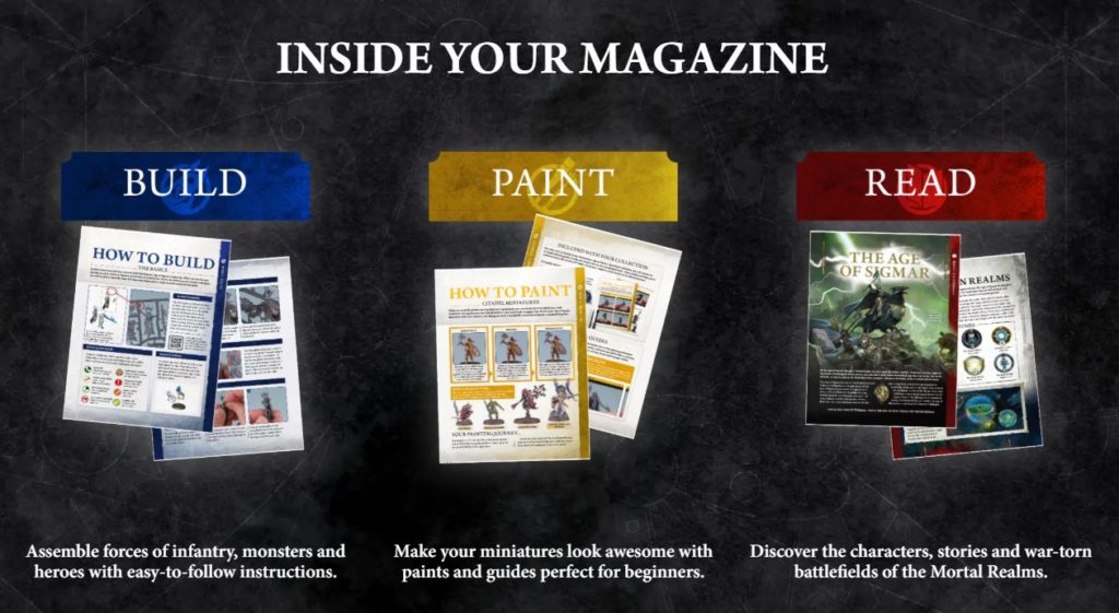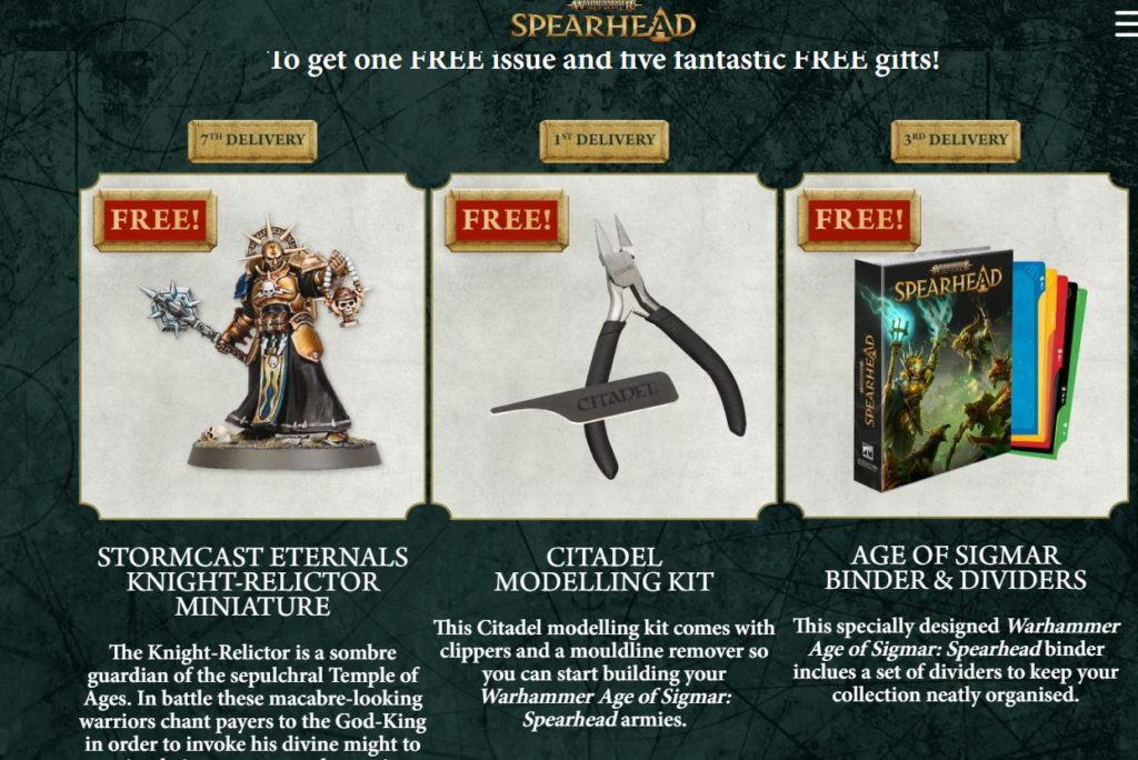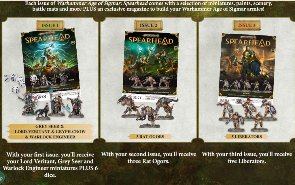 マガジンを少しずつ購入し、おまけミニチュアをある程度揃えれば最終的に1陣営分のスピアヘッド1セットが完成していく、模型誌+スターターセットを掛け合わせたスタイルです。どうやらスピアヘッドに欠かせない専用テレインやカードなども一部の号にはついてくるようで。いやあお得ですね。