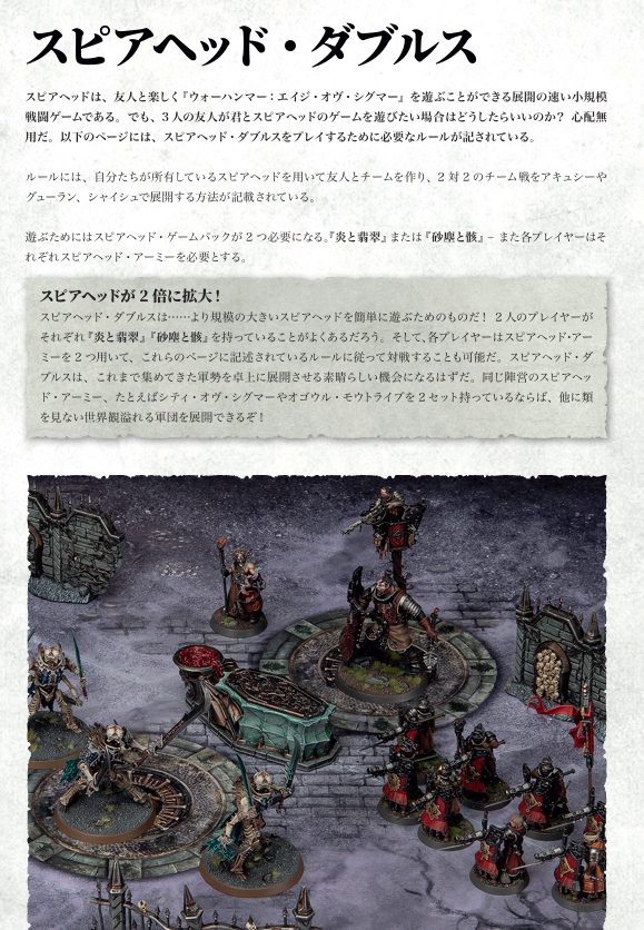 スピアヘッドはだいたい1BOXセットを買えば揃う形式ですので、このスタイルでの遊び方がより身近になるのではないでしょうか。また複数陣営の動かし方を一度に体験できるため、AoS全体の理解を深める意味でも有効です。いや本当に初心者で最初の最初にやるには思いとは思いますが。